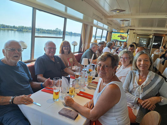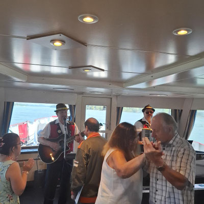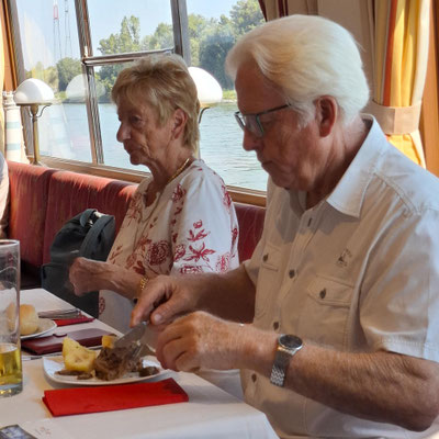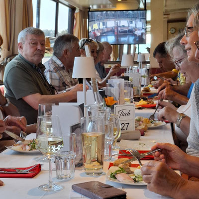 Um 9:45 Uhr war Einstieg, und pünktlich um 10:00 Uhr hieß es „Leinen los“. Es gab ein schmackhaftes Brunch-Buffet mit warmen und kalten Speisen. Die Schloßkogler sorgten mit Tanz- und Showeinlagen für gute Stimmung. Vom Schiff aus konnte man die Stadt und die Landschaft einmal aus einer anderen Perspektive betrachten.